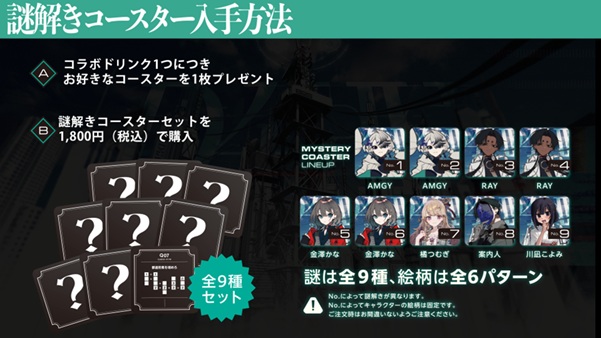 「謎解きコ-スタ-」は、コラボドリンク1点につきお好きな種類を1枚プレゼントさせていただくほか,1,800円(税込)にてコースター9枚セットの販売も実施いたします。