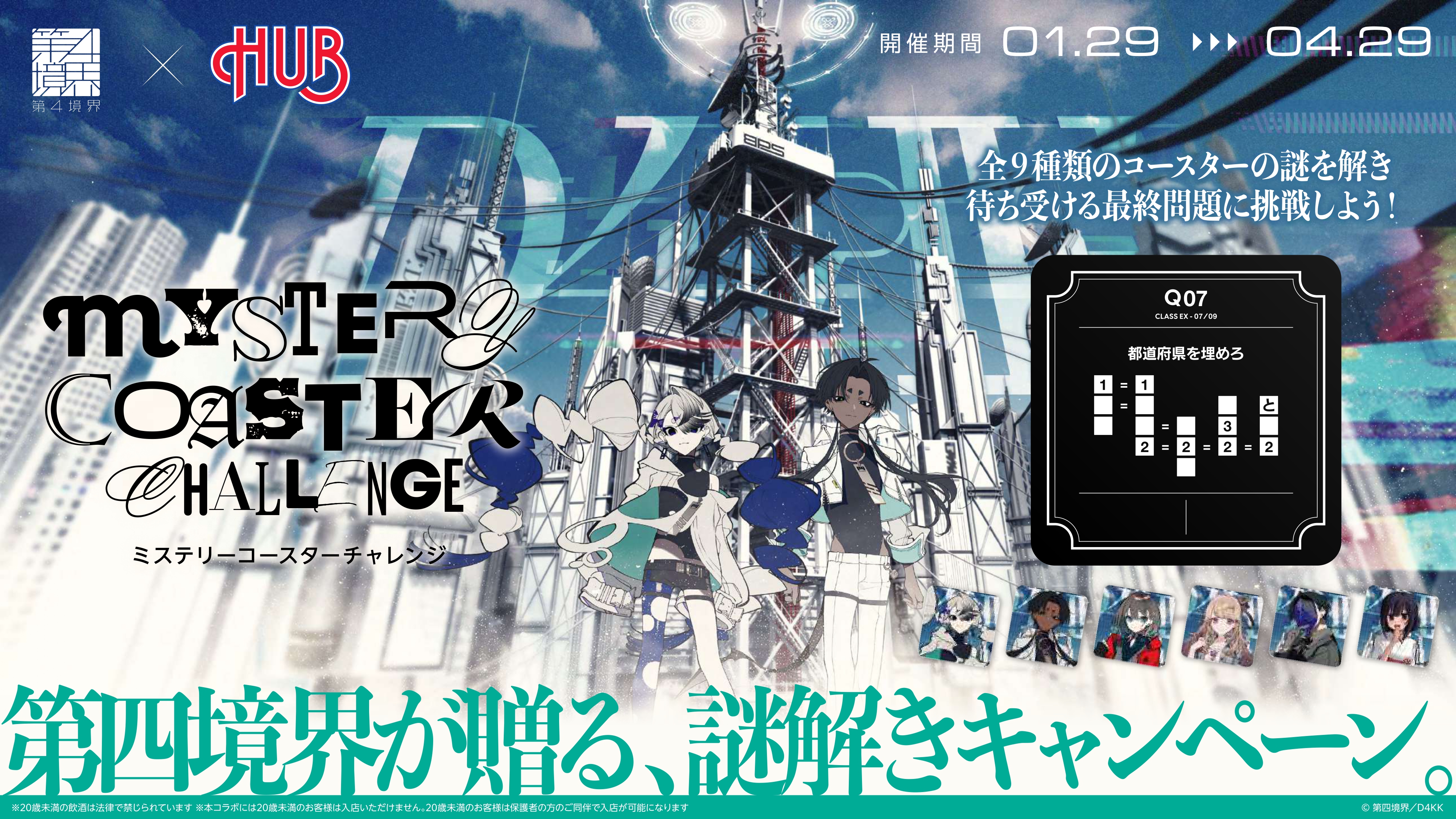 謎解きは、第四境界をイメージしたコラボドリンクの注文特典である「謎解きコ-スター」に描かれており、全9問をお楽しみいただけます。