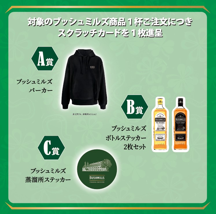 対象のブッシュミルズ商品の購入ごとにオリジナルグッズが当たるスクラッチカードを1枚進呈!