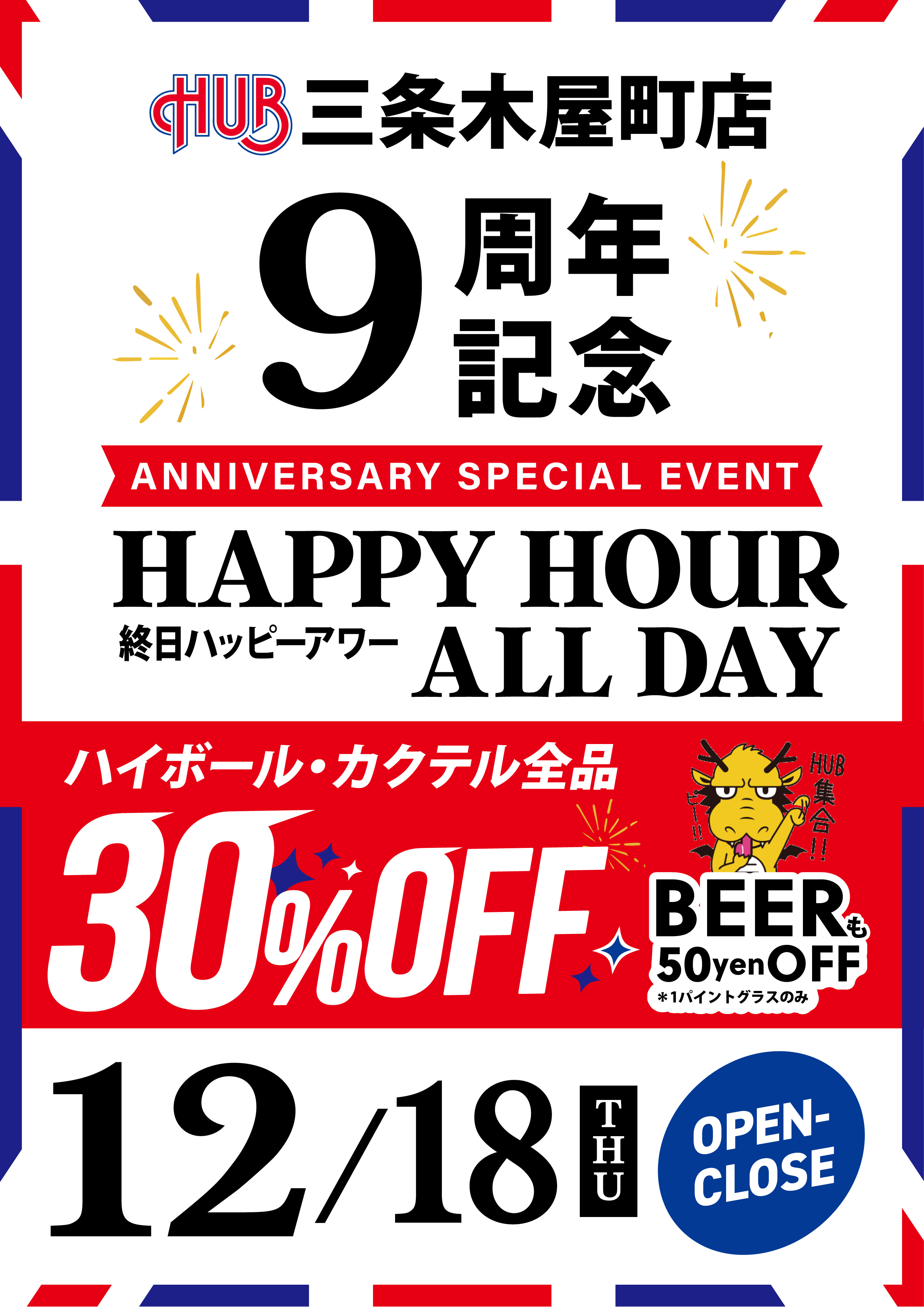 12/18(THU)HUB三条木屋町店9周年特別企画