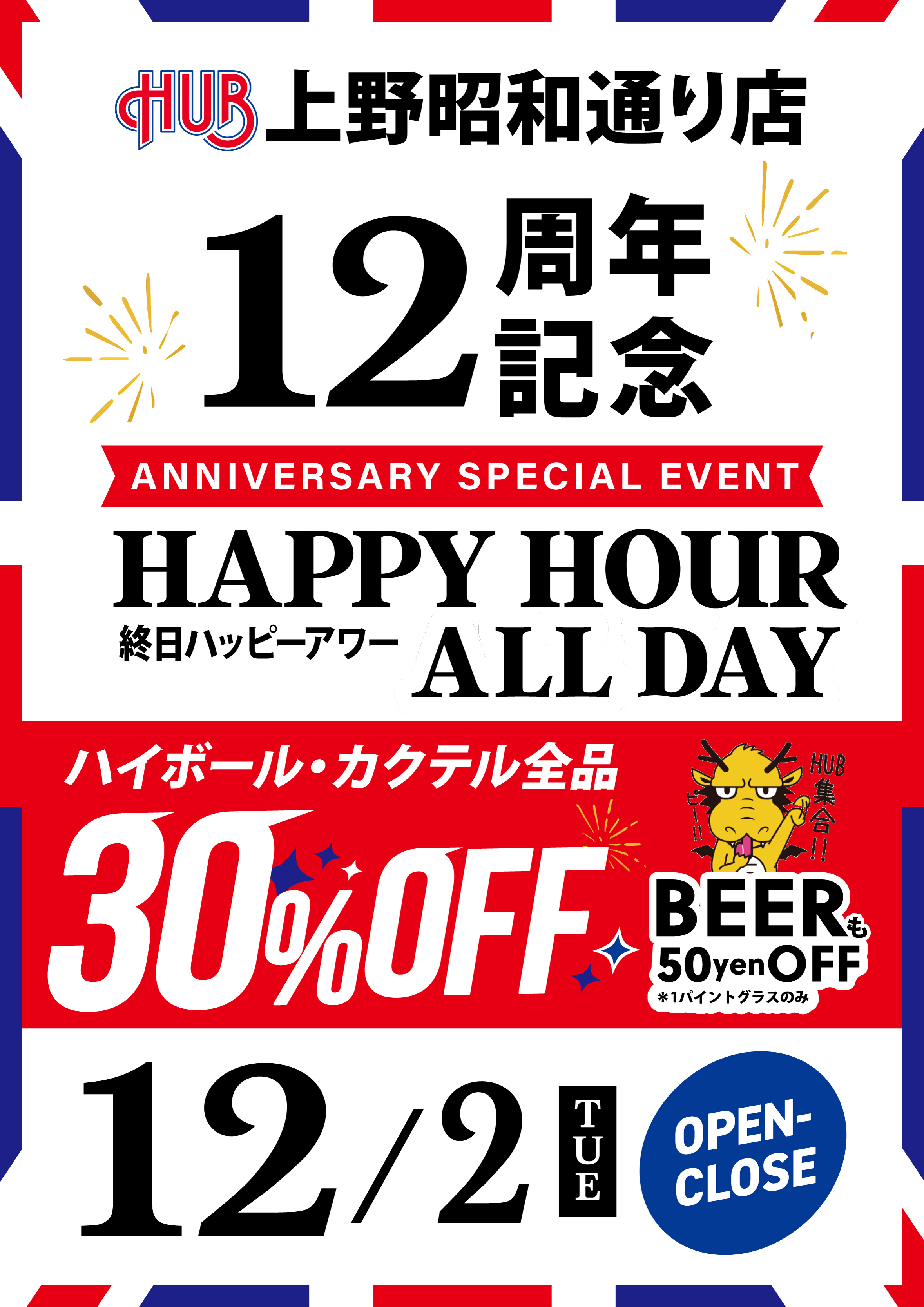 12/02(TUE)HUB上野昭和通り店12周年特別企画