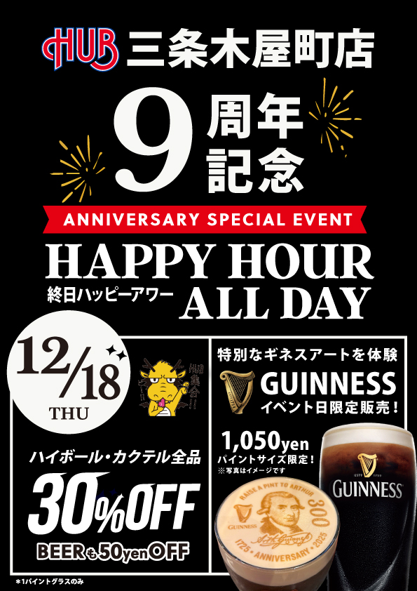 12/18(THU)HUB三条木屋町店9周年特別企画