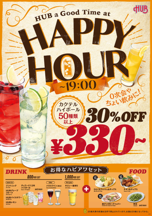➤ HUB店舗:30% OFF(カクテル・ハイボール・ソフトドリンク)