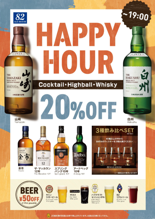 「 HUB 」「82」のハッピーアワーの強みは、なんと言っても値引き対象のドリンクラインナップの多さに加えてそのリーズナブルさ!!