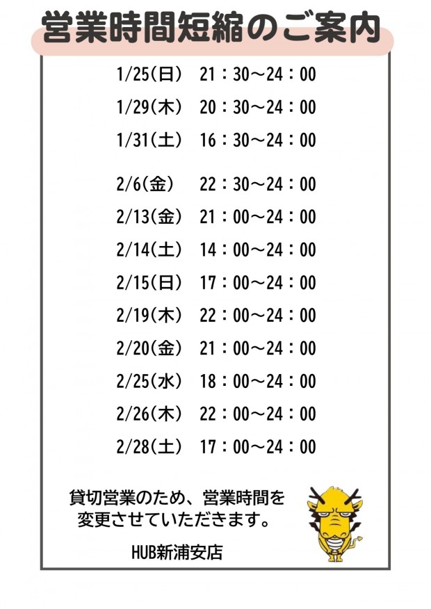 1月~2月営業時間変更のお知らせ
