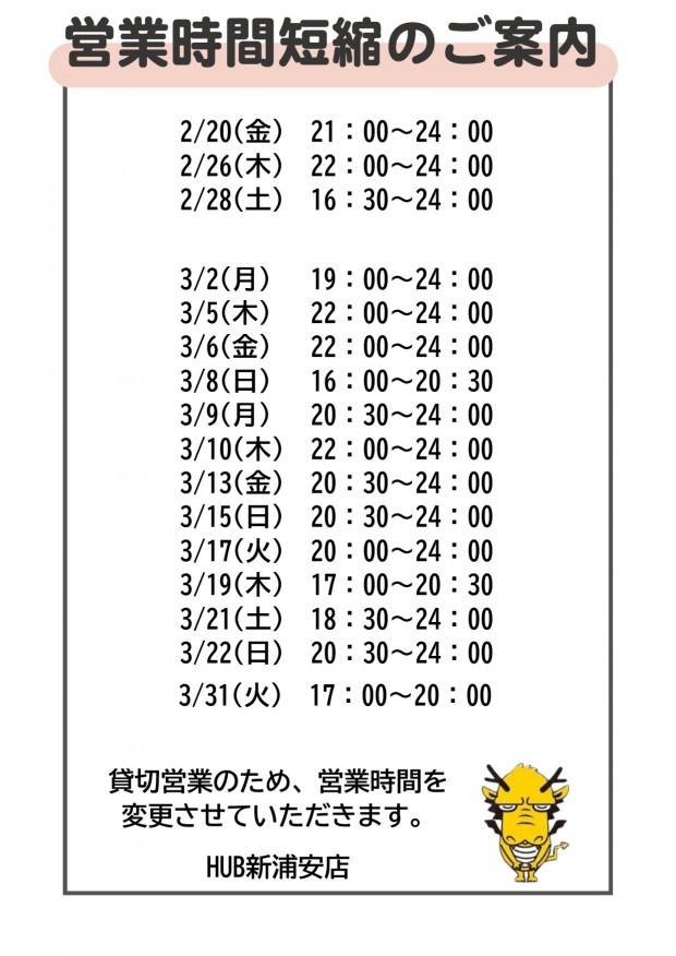 2月~3月営業時間のお知らせ