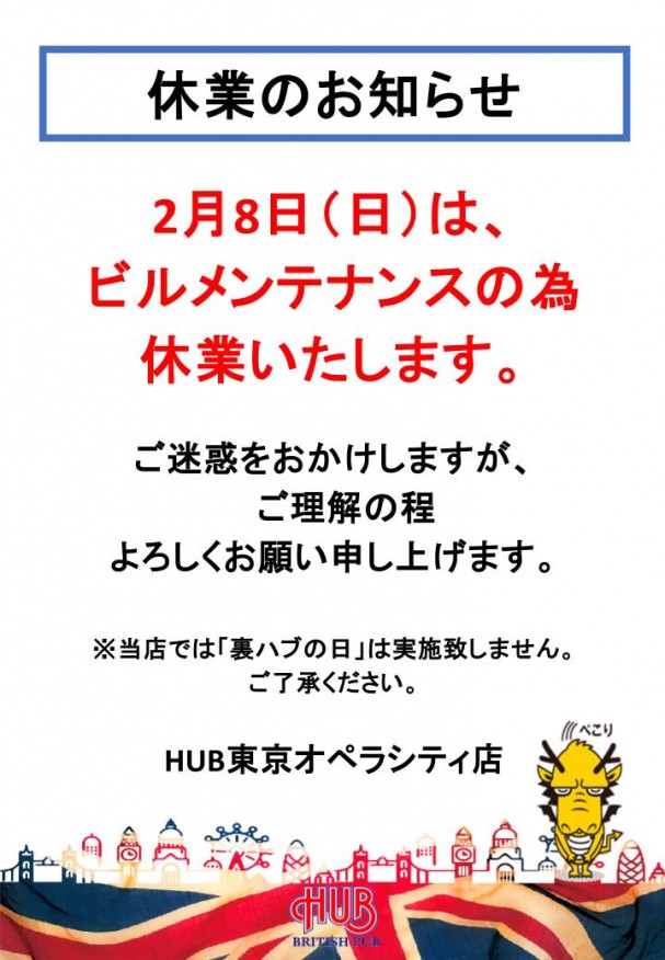 2月8日(日)休業のおしらせ