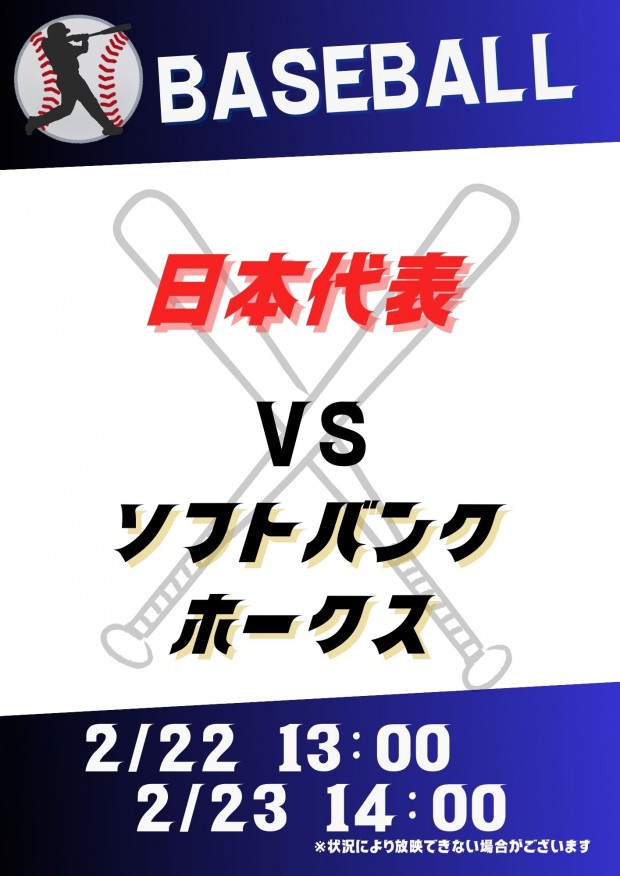02/22(日)13:00 野球 日本代表 vs. ソフトバンクホークス