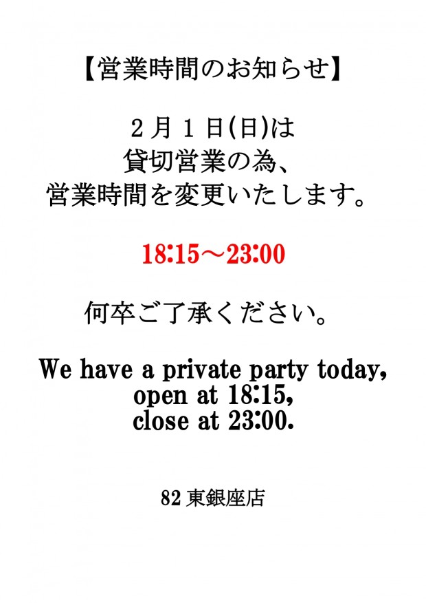 貸切営業のお知らせ