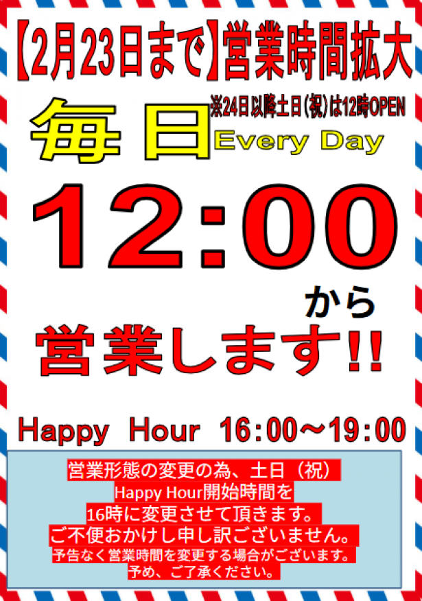 2月の営業時間変更のお知らせ