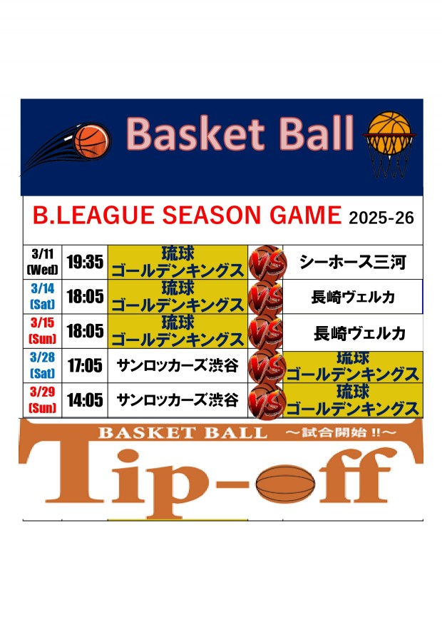 03/15(日)18:05 バスケットボール 琉球 vs. 長崎