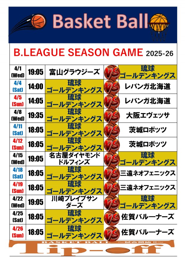 04/25(土)18:05 バスケットボール 琉球 vs. 佐賀