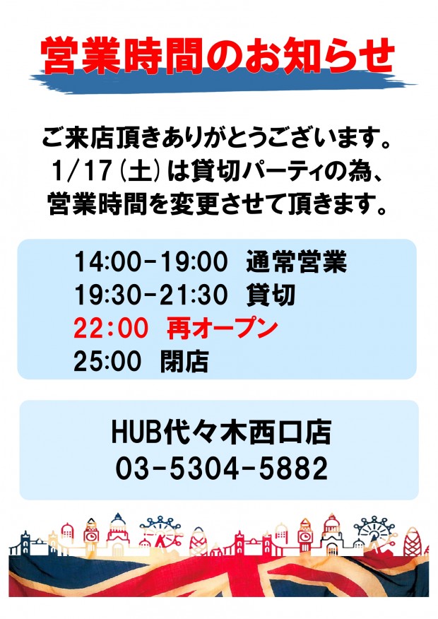 1月17日は19時半~21時半まで貸切営業を実施させて頂きます。